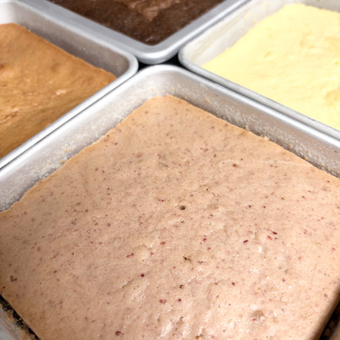 After baking, each cake is cut into individual tasting portions to fill small cake sample containers. The portions are then frosted and decorated according to their flavor profile. Each flavor has an elevated presentation style so that it's easy to identify cake flavors.